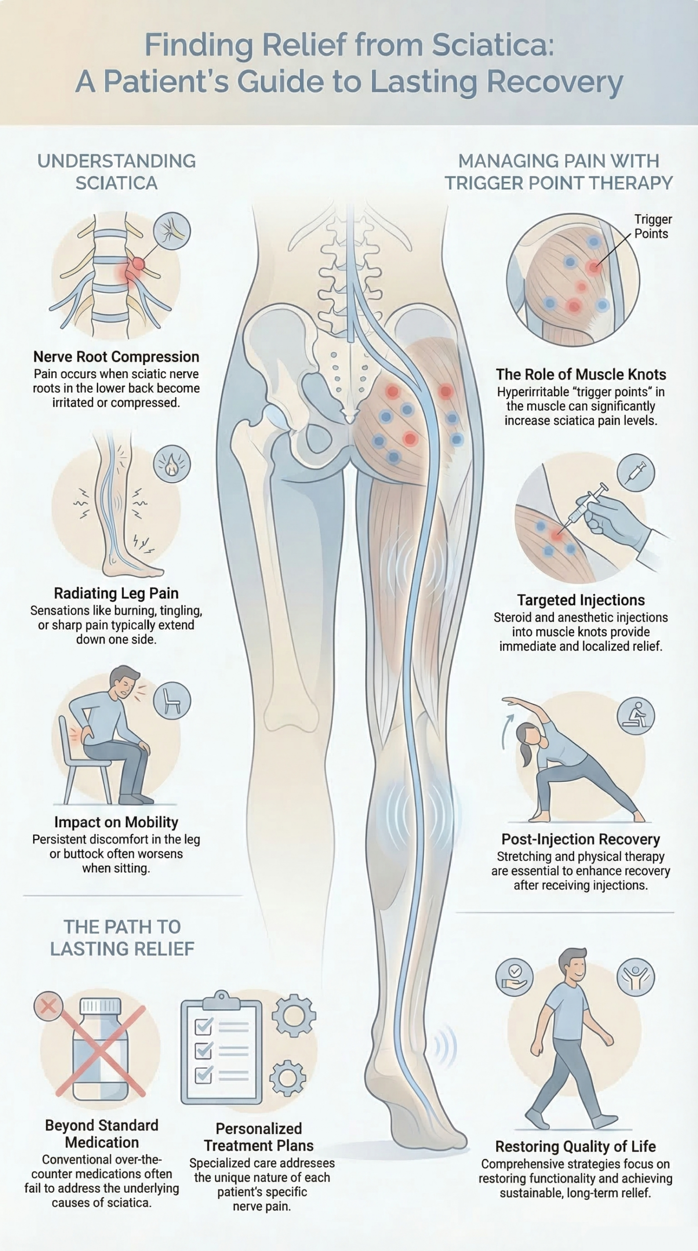 Sciatica back pain necessitates a comprehensive and personalized treatment strategy, which goes beyond the limitations of conventional pain relief methods. Through the expertise offered by pain management doctors, patients can access a range of advanced treatments, from trigger point injections to customized therapy plans, designed to address the unique aspects of their condition. These targeted interventions will not only alleviate pain but help to restore functionality and improve the quality of life for patients who are dealing with sciatica.