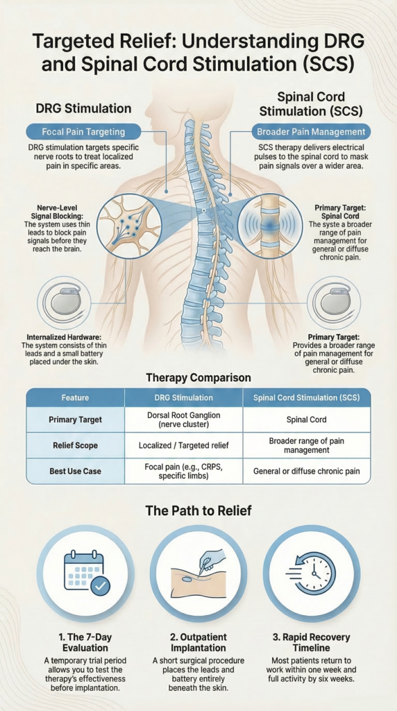 DRG stimulation is often considered for more localized or specific pain conditions that have not responded well to other treatments, including traditional SCS. DRG stimulation is particularly effective for localized nerve pain conditions such as neuropathy.