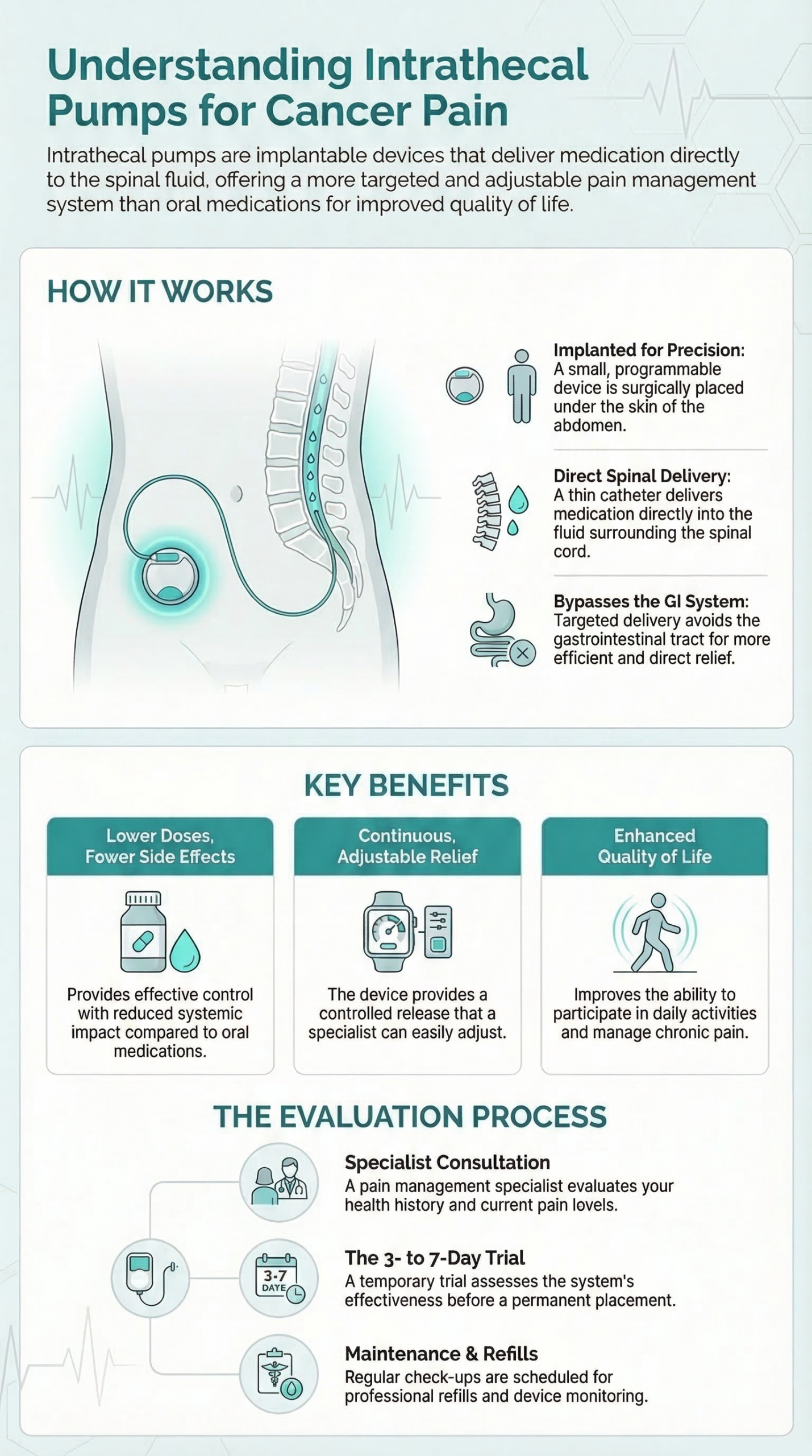 Deciding whether an intrathecal pump is suitable for managing your cancer pain involves a comprehensive evaluation by a pain management specialist. Factors to consider include the type and intensity of your pain, your overall health status, and how you’ve responded to other pain management therapies. It’s also important to have a thorough understanding of the procedure, potential benefits, and risks associated with the use of an intrathecal pump.
